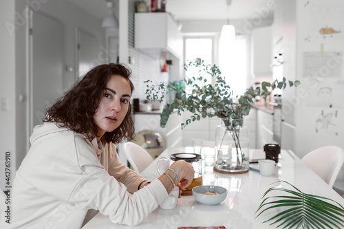 woman, sitting, kitchen, table, drinking, tea, 1, copy space, people, adult, female, glasses, white, home, leisure, lifestyle, modern, decoration, twig, window, day, casual attire, hooded, jacket, cup, flat, teapot, open, plan, palm leaf, mid, caucasian, brown hair, hair, colours, drink