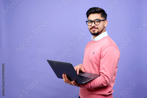 Portrait of young adult South Asian man wearing glasses looking into camera holding laptop computer while standing against plain purple background, showing confident expression
