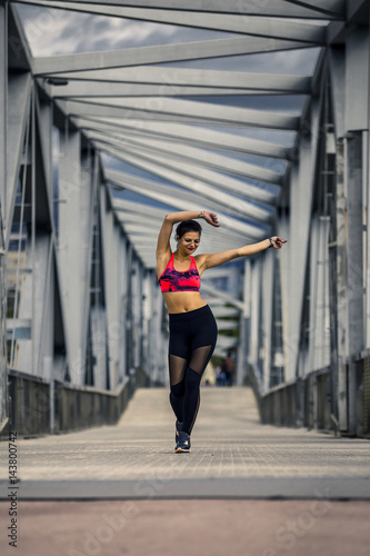 Portrait of young and sporty woman in sportswear walking along the bridge in Port Forum, Barcelona, Spain.