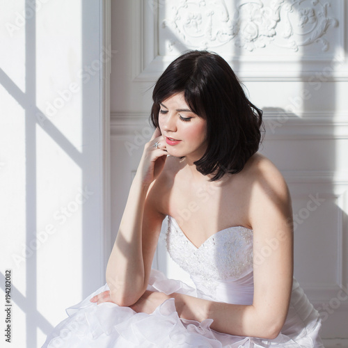 Portrait of young attractive brunette with short hair in a wedding dress. Standing at the white walls. Joyful bride.