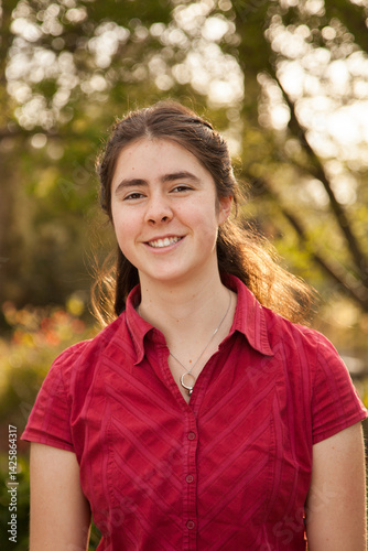 portrait, young, australian, person, outside, happy, people, girl, red, outdoors, female, missy, smile, beautiful, teenage, teenage, fresh, pretty, bokeh, teenage, natural light, brunette, missy, teenage, backlit, vertical, warm light, grin, blouse