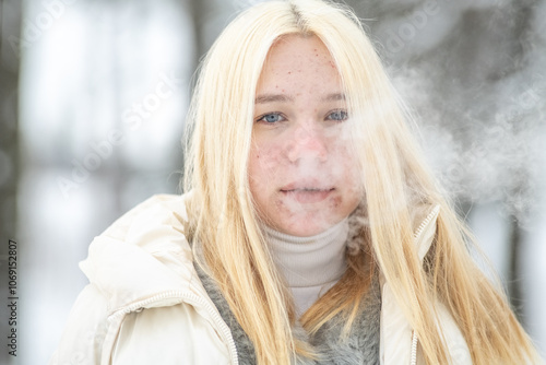 Portrait of young beautiful blonde girl outdoors in winter.