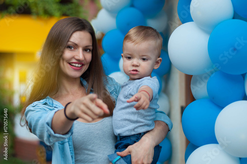 Portrait of young beautiful mother with her year-old baby boy.Both point the finger in front of him on the camera on balloons background