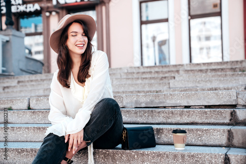 Portrait of young beautiful smiling hipster woman in trendy summer white blouse and jeans. Carefree woman posing in the street in sunny day. Positive model outdoors. Cheerful and happy