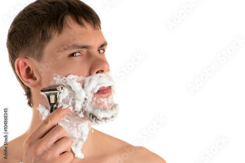 portrait of young caucasian male in shaving foam shaving razor sharp