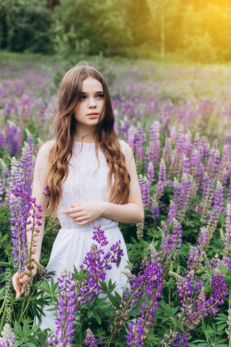 Portrait of young cute brunette girl in lupine violet field in blossom in summer sunset. Greenhouse, nature, natural beauty, freedom, youth concept
