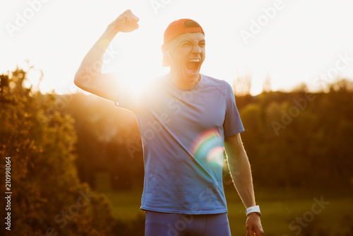Portrait of young fit male athlete enjoying victory in the marathon outdoor. Handsome runner win the competition, rise the hand and scream, enjoy success. Sport and people concept.
