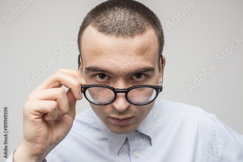 Portrait of young handsome man in blue shirt looking through his glasses. Doctor or businessman or professor style concept. Selective focus and shallow DOF