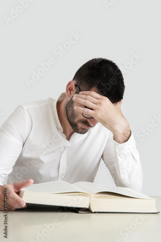 young, man, book, dyslexia, student, teacher, businessman, prof, reading, goggles, eyeglass, homework, study, studying, school, struggle, research, education, learn, read, cognition, business, university, office, person, sitting, hobby, sleepy, bored, exam, college, people, adult, caucasian, work, information, portrait, attractive, 1, professional, concentration, face, studio, isolated, background, table, white, desk, male, grey