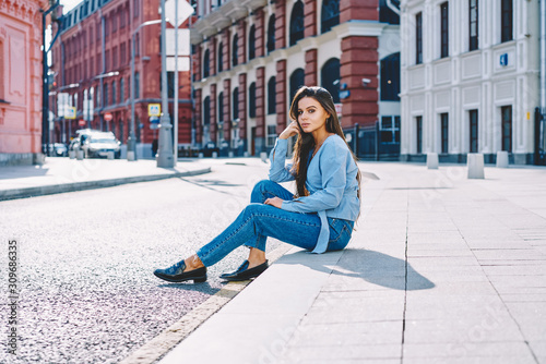Portrait of young hipster girl sitting for little rest while spending time on city street, attractive female student in fashion apparel looking at camera and recreating outdoors on urban setting