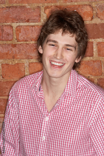 young, man, male, 20s, 20s, person, caucasian, posing, looking, photogenic, brown, hair, half, length, at, camera, smiling, confident, casual attire, shirt, studio, brick, wall, vertical