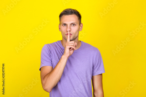 fashion, young, background, hand, gesture, happiness, people, attractive, standing, happy, showing, photogenic, beautiful, yellow, style, quiet, caucasian, clothing, lifestyle, guy, trendy, face, finger, studio, male, t-shirt, expression, positive, smile, man, success, purple, silence, looking, joyful, model, boy, cheerful, person, modern, portrait, confident, adult, joy, emotion