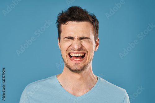 blue, background, man, face, isolated, male, guy, young, happy, portrait, student, studio, boy, casual attire, person, beard, hipster, jumping, hot, backpack, jump, head, energy, pointing, clothes, side, through, teeth, barbershop, paper, youth, sale, university, discount, look, ok, hole, half, barber, finger, view, short, sunglasses, himself, hot drink, denim, teenage, creative, emotion, concept