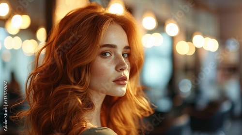 portrait of young pretty ginger woman face, sitting on hair salon to get a hair cut in hairdresser salon,