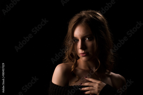 portrait, young, woman, model, black, background, attractive, beautiful, beauty, caucasian, dark, dress, emotion, eye, face, fashion, female, front, girl, hair, healthy, lip, low key, person, photoshoot, posing, sexy, skin, studio, white, missy