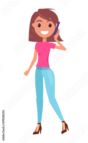 young, girl, talking, phone, mobile, happy, smiling, conversation, posing, cheerful, discussing, vector, portrait, avatar, jean, pink, t-shirt, stylish, shoe, heel, woman, beautiful, pretty, call, bob, coiffure, brunette, style, modern, adult, smile, lady, classic, clothes, clothing, slim, talk, figure, cute, fashionable, model, loving, trendy, skinny, fashion, elegant, cartoon, character, mobile phone, femininity