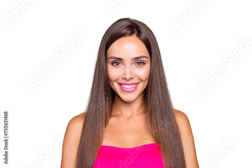 Portrait of young straight-haired brunette cute smiling girl, wearing pink top. Isolated over bright vivid turquoise teal background