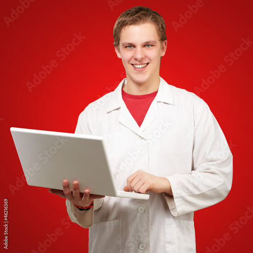 portrait of young student holding laptop over red background