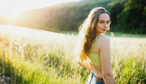 caucasian, woman, girl, young, teenage, youth, teenage, teenage, beautiful, pretty, model, portrait, cute, female, happy, summer, person, attractive, outdoors, outside, nature, countryside, rural, standing, sunset, evening, beauty, smiling, smile, head, long hair, dark, shirt, blue, copy space, green, grass