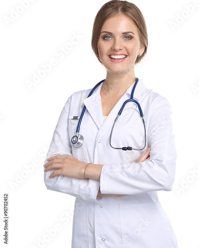Portrait of young woman doctor with white coat standing in