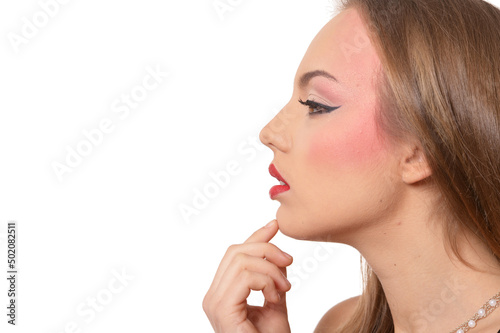 adult, attractive, background, beautiful, beauty, caucasian, cheerful, creative, emotion, eye, face, female, fresh, freshness, girl, holiday, isolated, joy, lady, lifestyle, make up, person, portrait, pose, posing, positive, pretty, studio, white, woman, young