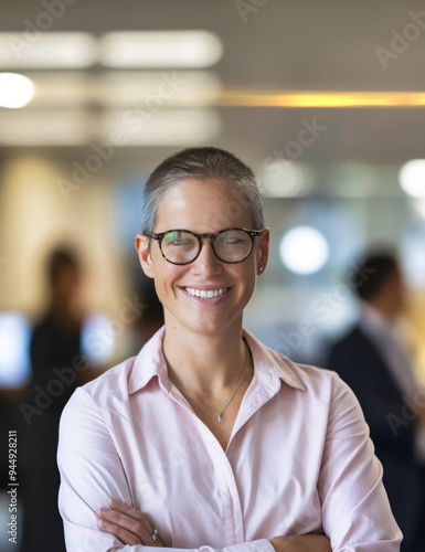 Portrait, person or employee with cooperation, staff or professional with brainstorming in a workplace. Face, business and woman with arms crossed, smile and career with teamwork, meeting or planning.