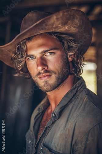 portrait, photo, candid, muscular, young, photogenic, cowboy, hat, man, wavy, hair, short, beard, standing, looking, camera, american, horse, blurred, background, romantic, book, character, rugged, charming, masculine, farm, outdoors, stylish, charismatic, confident, western, rustic, vintage, authentic, strong, aesthetic, countryside, iconic, dramatic, natural, moody, artistic, mysterious, bold, classic, evocative