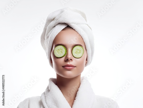 portrait photo of a supermodel enjoying a spa day with cucumber slices on eyes, tranquil and pampered, isolated on spa white background