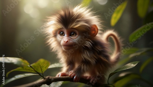 monkey, wildlife, nature, mammal, primate, young, innocence, curiosity, fluffy, tree branch, green leaf, softness, detail, animal portrait, perched, holding, serene, peaceful, closeup, fauna, whisker, delicate, sunlight, tranquil, baby animal, climbing, twig, solitude, wilderness, gaze, observant, ecosystem, depth of field