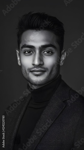 Portrait photograph of an attractive young Indian man, in black and white
