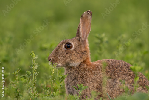 portrait rapproché d'un lapin de garenne dans un champ de luzerne, un soir de printemps
