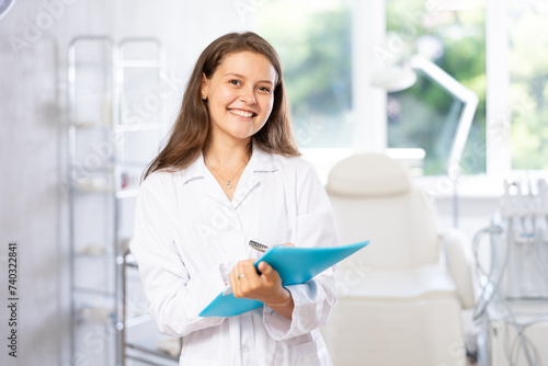 Portrait shot of female doctor holding clipboard in hand while standing in medical esthetic office