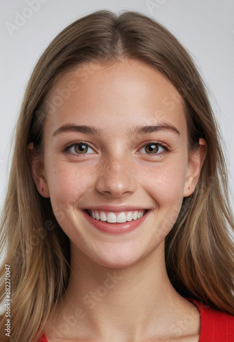 Portrait view of a regular happy smiling Liechtenstein girl, ultra realistic, candid, social media, avatar image, plain solid background
