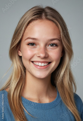 Portrait view of a regular happy smiling Norway girl, ultra realistic, candid, social media, avatar image, plain solid background