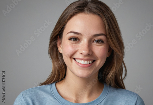 Portrait view of a regular happy smiling United States woman, ultra realistic, candid, social media, avatar image, plain solid background