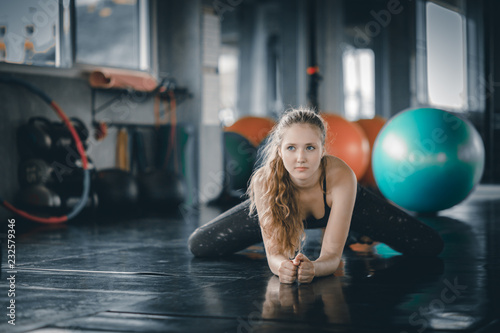 Portrait young attractive healthy woman body curve fitness doing exercises workout with ball in gym. People beauty perfect body slim fitness girl. Freedom happy and relax lifestyle healthcare concept.
