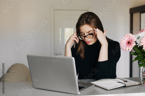 Portrait young stressed displeased worried business woman with headache sitting in front of laptop. Mental illness at remote work concept.