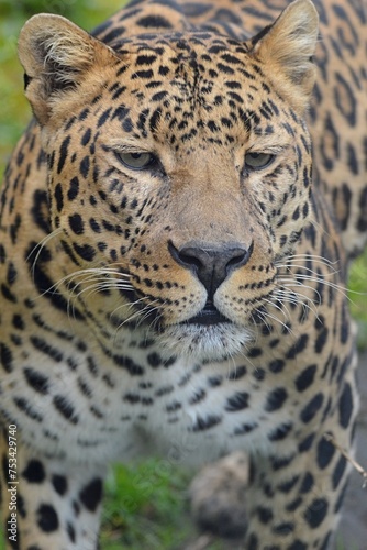 Portret of large adult leopard, latin name Panthera Pardus, walking relaxed on lawn in his yard of safari park.