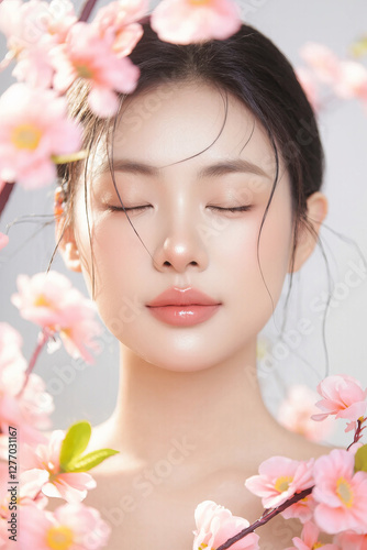 Porträt einer jungen asiatischen Frau, umgeben von Frühlingsblumen. Ihr sanftes Gesicht symbolisiert Natürlichkeit und Schönheit – perfekt für Naturkosmetik und Beauty-Brands. Generative KI.