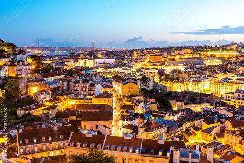 Portugal, Lisbon, Miradouro da Graca, View of city with Ponte 25 de Abril at dusk