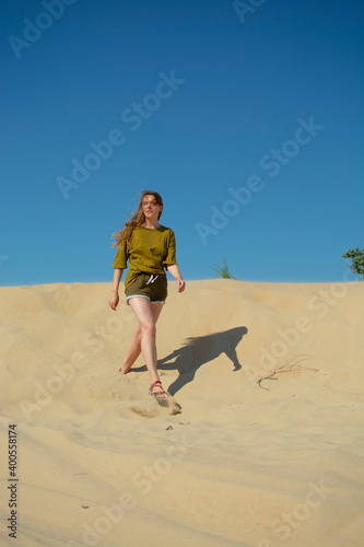Positive and active young woman silhouette walking near the sea beach. Resort vacation. A person's activities beautiful portrait.