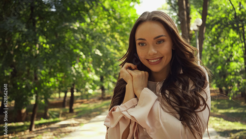 green, beautiful, happy, season, smiling, summer, park, outdoors, cheerful, caucasian, plant, flora, brunette, tree, emotion, blur, woman, joyful, attractive, casual attire, positive, pleased, copy space, one person, young adult