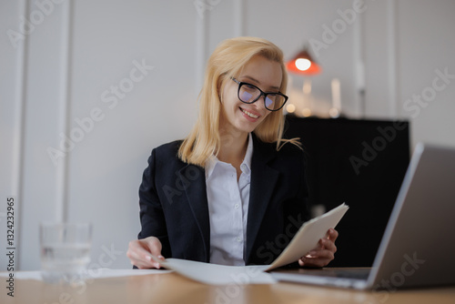 Positive business professional. Woman working on projects in the office. Manager doing job.