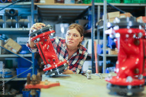 Positive female worker assembling by hand shutoff valves in a factory