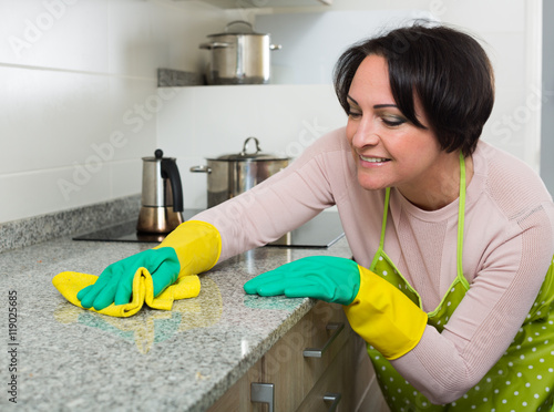 Positive housewife polishing kitchen surfaces