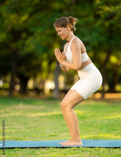 Positive sporty young woman demonstrating harmonious strength and flexibility of seasoned yogini performing advanced yoga posture on mat on green glade in serene sunlit summer park..