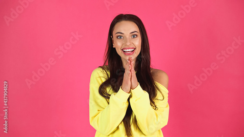 yellow, background, isolated, beautiful, happy, smiling, clothing, beauty, cheerful, caucasian, brunette, style, fashion, pink, emotion, pretty, woman, make-up, mascara, trendy, clothes, faith, attractive, casual attire, amazed, astonished, positive, excited, lipstick, hope, pray, ask, visage, pullover, belief, please, sweatshirt, copy space, one person, studio shot, young adult, eyeshadow