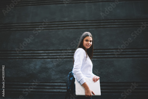 woman, positive, student, laptop, contraption, portable, young, optimist, device, feminine, walk, computer, female, generation, education, modern, cheerful, happy, smile, joy, contemporary, glad, lady, free time, stroll, confident, independent, individuality, charismatic, youth, slim, satisfied, town, intelligent, alone, building, freedom, personality, calm, brunette, concrete, enjoy, pleasant, friendly, horizontal