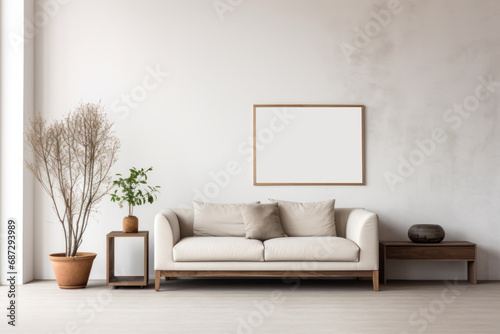 Poster mockup above white cabinet with plant next to grey sofa. The plant in white vase and the branch in ceramic pot. Simple living, minimalist home design. modern and minimalist living room interior