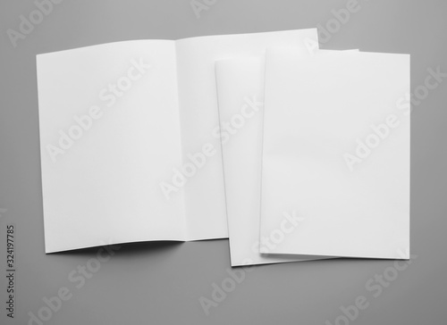 Poster mock-ups paper, white paper isolated on gray background, Blank portrait paper A4. brochure magazine , can use banners products business texture background for your. newspaper